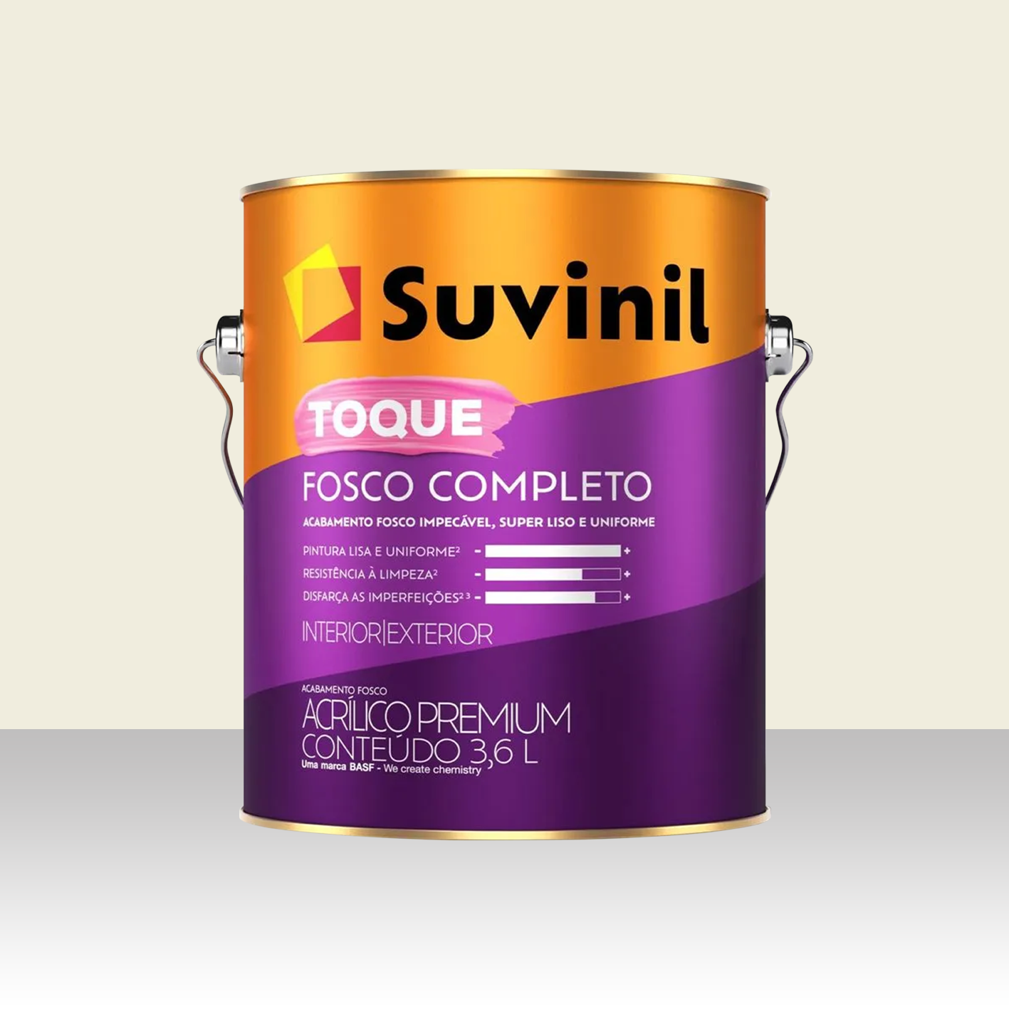 A tinta Suvinil Toque Fosco Completo proporciona acabamento fosco aveludado, boa cobertura em 2‑3 demãos, diluição de 20 % de água, secagem rápida (2 h ao toque, 4 h entre demãos, 12 h final), sem cheiro e lavável.