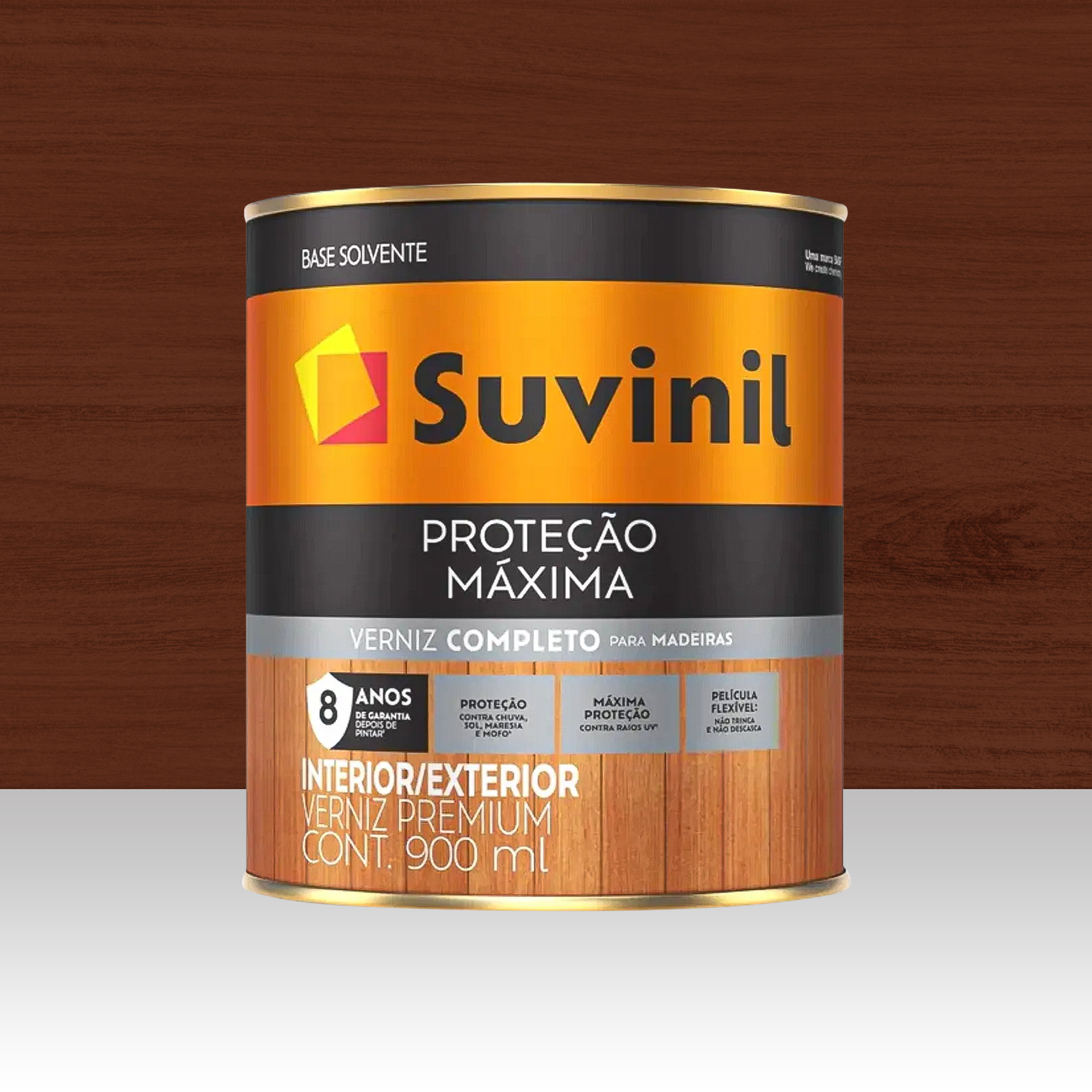 O verniz Suvinil Proteção Máxima é base solvente, acabamento brilhante que protege a madeira contra sol, chuva e maresia. Forma película flexível, resistente e durável para áreas internas e externas.
