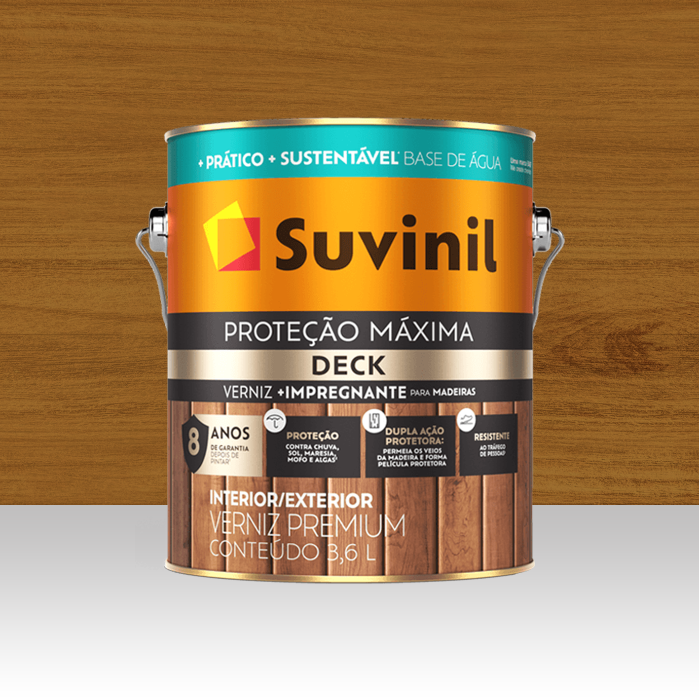 O verniz Suvinil Proteção Máxima Deck realça a beleza natural da madeira e protege contra sol, chuva e mofo. Ideal para áreas externas como decks e pergolados.