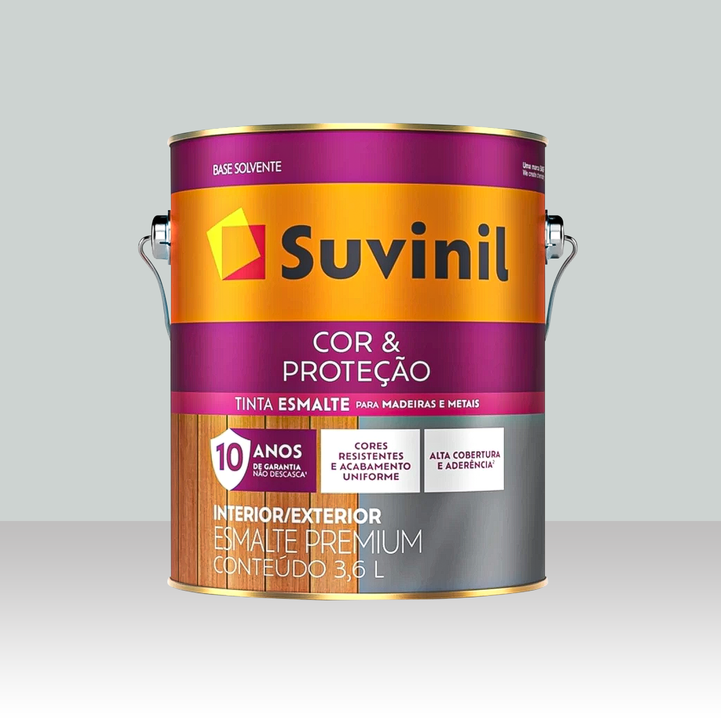 A tinta Suvinil Cor & Proteção Brilhante Base Solvente tem brilho intenso, alta durabilidade e proteção contra sol e chuva. Ideal para madeira e metal com acabamento sofisticado.