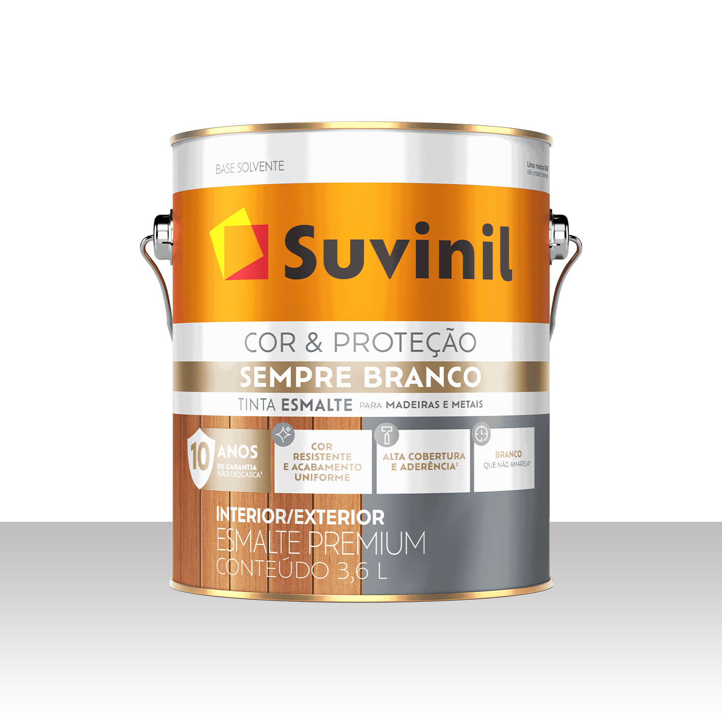 A tinta Suvinil Cor & Proteção Branca é esmalte para madeira e metal, fácil de aplicar, com ótimo acabamento e alta cobertura. Disponível em base solvente ou base água, conforme a necessidade.