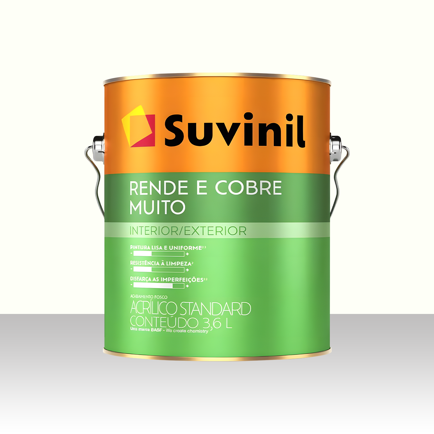 Suvinil Rende & Cobre Muito é a tinta que rende mais. O produto possui baixo odor, uma ótima cobertura e um excelente rendimento e ainda é fácil de espalhar. A Rende & Cobre Muito tem uma ótima consistência, o que facilita a aplicação após a sua diluição. Uma tinta fosca com 20 opções de cores para você pintar.